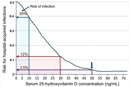 An inverse relationship between vitamin D status and the risk of hospital-acquired infections. The maximum reduction of the infection rate was achieved when the serum 25(OH)D concentration exceeded 50 ng/mL (i.e., the background rate). This supports that 50 ng/mL as the minimum level required to overcome infections. Data presented as a multivariable logistic regression analysis with a locally weighted scatterplot. To demonstrate differences in hospitalisation risks, the percentage risk of infections at serum 25(OH)D concentrations of 10, 30, and 50 ng/mL are illustrated. The blue arrow shows a background risk of approximately 2.5% (modified after Quraishi, S.A, et al., 2014) [].