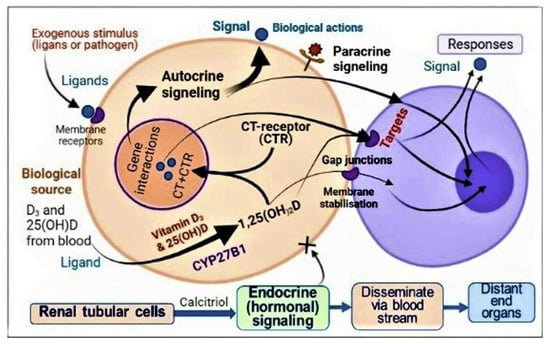 All peripheral target cells, including immune and vascular cells expressing high CTR concentrations and CYP2R1, thus, can convert 25(OH)D into calcitriol. In immune cells, this intracellularly generated calcitriol (not the hormonal form in the circulation) combines with its cytosolic CTR receptors to form calcitriol–CTR complexes and translocates into the nucleus to interact with DNA as described above. It initiates autocrine and paracrine signalling in immune cells, as represented in Figure 4.