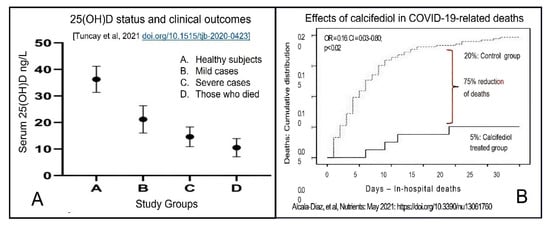 (A). A significant inverse correlation between serum 25(OH)D concentrations and the severity and mortality from COVID-19 (after Tuncay et al., 2021) []. (B). The cumulative in-hospital mortality of those treated with calcifediol versus a control group. Mortality was 5% in the treated group versus 20% in the placebo group: a reduction of 75% in mortality rate in the calcifediol-treated group (After Alcala-Diaz, et al., 2021) [].