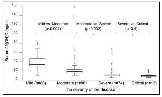 Box plots [range of serum 25(OH)D concentrations of 50% of the cases, within the interquartile range] indicated a significant association between the severity of COVID-19 and pre-infection serum 25(OH)D concentration (n = 253). The comparisons were made between mean vitamin 25(OH)D concentrations with four severity categories of COVID-19—mild to critically ill, using the WHO definition of severity (WHO/2019-nCoV/clinical/2020.5). The p-values are presented after multiple-category comparisons using the nonparametric Kruskal–Wallis test. A Mann–Whitney U-test compared 25(OH)D concentrations with the mean rank of neighbouring sequential categories, and individual outliers are presented with open circles (after Drorl et al., 2022) [].