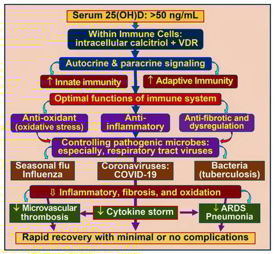 Figure 7 also illustrates the importance of maintaining serum 25(OH)D concentration above 50 ng/mL for immune cells to function appropriately and mediate their crucial autocrine and paracrine functions. Optimal functioning or innate and adaptive immune responses would prevent cytokine storms and complications from infections, leading to a rapid recovery from the illness. The following section discusses the rare potential complications from excess vitamin D.