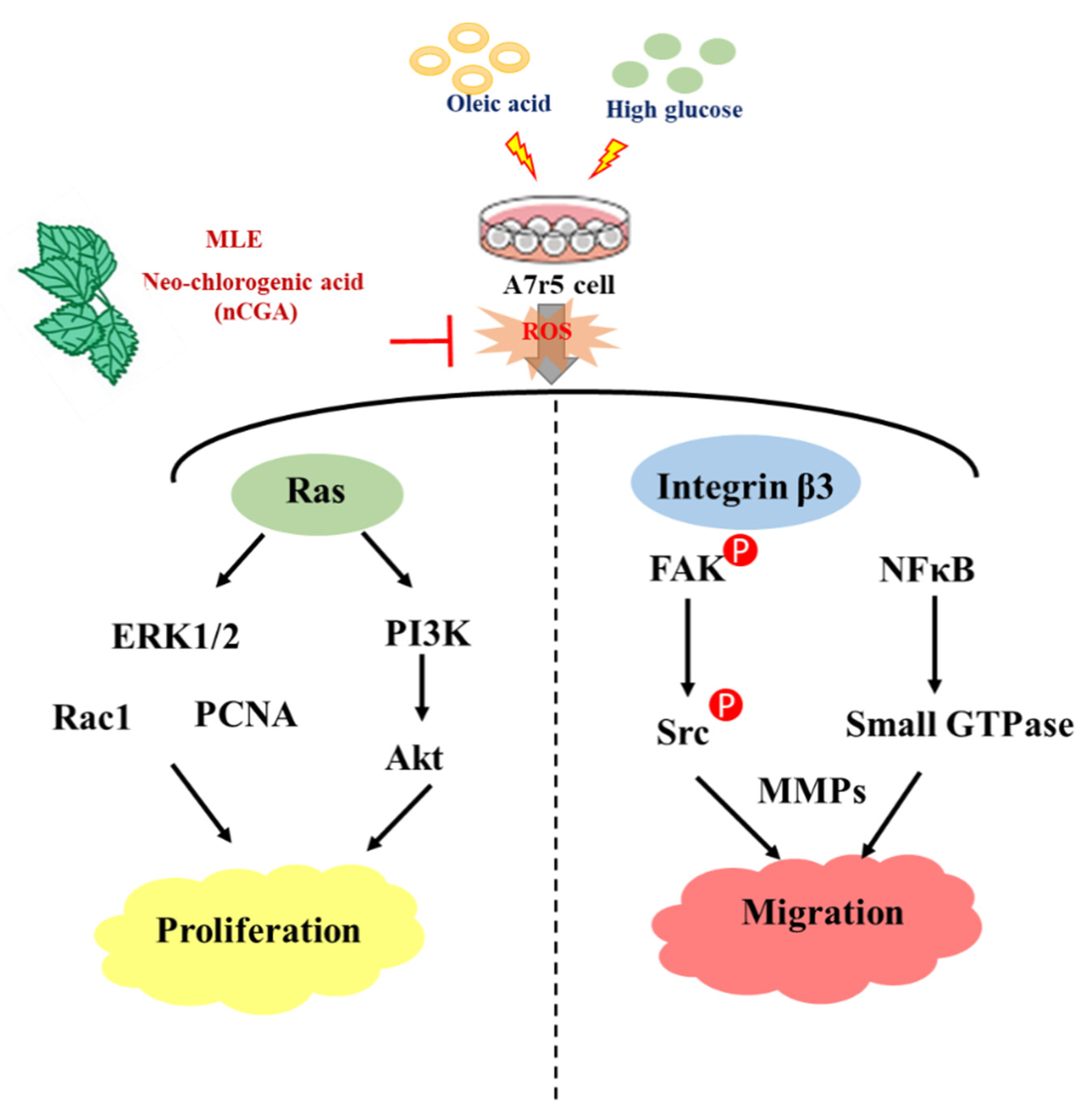 Chicago/Turabian StyleYang, Tsung-Yuan, Yi-Liang Wu, Meng-Hsun Yu, Tung-Wei Hung, Kuei-Chuan Chan, and Chau-Jong Wang. 2022. "Mulberry Leaf and Neochlorogenic Acid Alleviates Glucolipotoxicity-Induced Oxidative Stress and Inhibits Proliferation/Migration via Downregulating Ras and FAK Signaling Pathway in Vascular Smooth Muscle Cell" Nutrients 14, no. 15: 3006. https://doi.org/10.3390/nu14153006