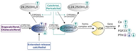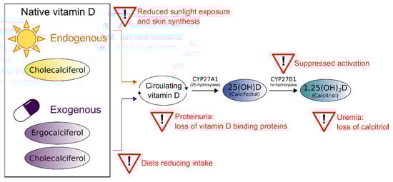 For multiple reasons, CKD patients often face deficiencies in both inactive vitamin D (calcidiol or 25-hydroxyvitamin), as well as active vitamin D (calcitriol or 1,25-dihydroxyvitamin D). This might be caused by impaired skin synthesis or prescribed dietary restrictions reducing the availability of the 25-hydroxyvitamin D precursors cholecalciferol/ergocalciferol []. Also, CKD suppresses the 1α-hydroxylase CYP27B1, which catalyzes the activation of 25-hydroxyvitamin D [,]. In addition to impaired biosynthesis, CKD-associated proteinuria and uremia lead to the loss of vitamin D binding proteins and 1,25-dihydroxyvitamin D []. Figure 1 summarizes the causes of vitamin D loss in CKD patients.