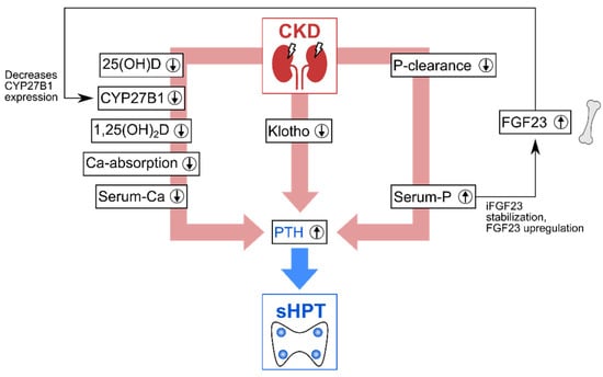 Main pathways in which chronic kidney disease (CKD) leads to elevated parathyroid hormone (PTH) levels, causing secondary hyperparathyroidism (sHPT). Circled arrows indicate increases (↑)/decreases (↓). Adapted from Germain (2020) [] and Leifheit-Nestler and Haffner (2021) []. CKD—chronic kidney disease, 25(OH)D—Calcidiol, 1,25(OH)2D—Calcitriol, Ca—calcium, P—phosphorus, FGF23—Fibroblast growth factor-23, iFGF23—intact FGF23, PTH—parathyroid hormone, CYP27B1—1α-hydroxylase.