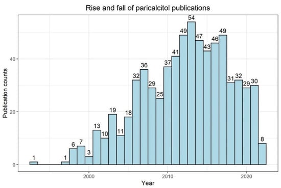 PubMed search results for “paricalcitol” (as of 24 May 2022; https://pubmed.ncbi.nlm.nih.gov/, accessed on 24 May 2022). The bin width is 1 year. Numbers on top of bars indicate counts.