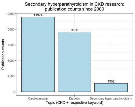 PubMed search results from 2000 to 2022 for “CKD” and one of the following keywords, as of 25 May 2022: “Cardiovascular”, “Diabetic” or “Secondary hyperparathyroidism”; https://pubmed.ncbi.nlm.nih.gov/, accessed on 25 May 2022). Numbers on top of bars indicate counts.