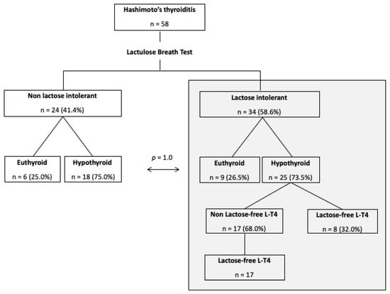 In this regard, a previous study carried out in a cohort of HT patients demonstrated that lactose-intolerant patients needed a significantly higher dosage of replacement therapy, as compared to their lactose-tolerant counterparts [18]. On another note, a study demonstrated that an 8-week lactose-free diet, with no modification in LT4 dosage, led to a significant decrease in TSH values in a group of hypothyroid patients affected by HT with lactose intolerance [17]. Taken together, the results of these preliminary studies suggested that an early screening for lactose intolerance among HT patient could be recommended in order to identify a possible cause of LT4 malabsorption, and, therefore, to optimize treatment. However, in these studies the fact that the diagnosis of lactose intolerance was based only on the presence of malabsorption, without considering its actual etiology or excluding other common causes, represented a relevant limitation.