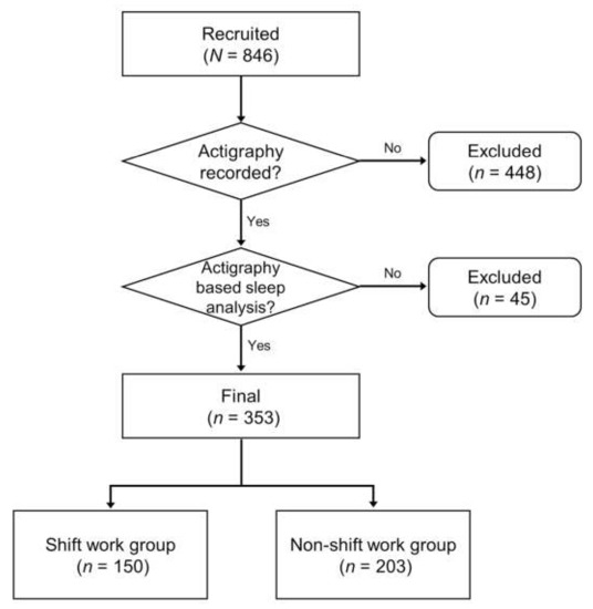Data were collected from 846 employees from Seoul National University Bundang Hospital (SNUBH). This study population included 412 shift workers and 434 non-shift workers aged 20 to 65. The data were collected from November 2017 to January 2019. In this paper, “shift workers” work more than or equal to six-night shifts in a month (working schedules are 6:00 p.m.–8:00 a.m., 7:00 p.m.–7:00 a.m., or 10:00 p.m.–7:00 a.m.). Otherwise, “non-shift workers” refer to those who work fixed daytime schedules (working schedules are set from 9:00 a.m. to 6:00 p.m.) or have shift work schedules without night (working schedules from 7:00 a.m. to 3:00 p.m. or from 2:00 p.m. to 10:00 p.m.). Of the total subjects (N = 846), 398 subjects participated in actigraphy recordings for successive days. We selected the final analysis group (n = 353) with actigraphy data for at least seven days. This last group comprised 150 shift workers and 203 non-shift workers (Figure 1). The data collected from this final group included actigraphy-based sleep and rest–activity rhythm parameters, clinical evaluation results, demographic information, and serum analysis.