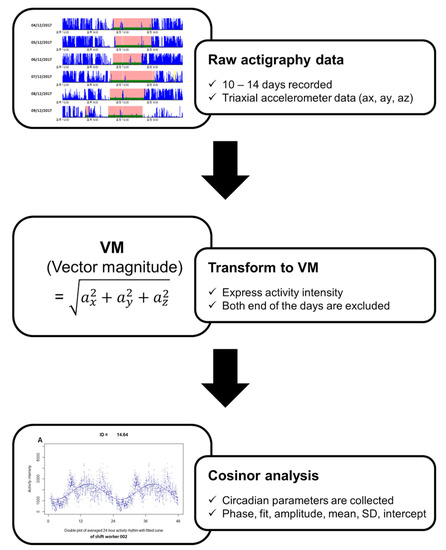 Flowchart of cosinor analysis process to collect actigraphy-based activity parameters. Raw actigraphy data were transformed as vector magnitude (VM) values, and rest–activity rhythm parameters were collected by cosinor analysis. This analysis was performed using R software.