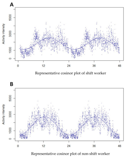 During shift work, sleep–wake cycles are misaligned with the endogenous circadian system, causing metabolic disruption and negatively affecting overall health [1]. Prior studies suggest prolonged night shift working may increase the risk for sleep and gastrointestinal problems, as well as aberrant metabolic responses [2,3,4]. Moreover, the disturbances of circadian rhythm are associated with major diseases, such as cardiovascular diseases or cancer [5,6]. Since shift workers have the disadvantage of irregular sleep schedules, they are at remarkably high risk of developing sleep problems.