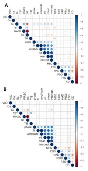 In Figure 4, although vitamin D levels positively correlated with calcium levels in both groups, vitamin D levels did not correlate with actigraphy-based sleep or activity parameters in shift workers. However, higher vitamin D levels were related to morning preference (higher MEQ) in non-shift workers. In addition, the results can easily have understood that sleep latency positively correlates with WASO and negatively correlates with SE in both shift and non-shift workers. However, there were positive correlations between sleep latency rest–activity rhythm parameters (phase, fit, amplitude, and SD) and negative correlation with the Connor–Davidson resilience scale in shift workers and two parameters (mean and intercept) in both groups.
