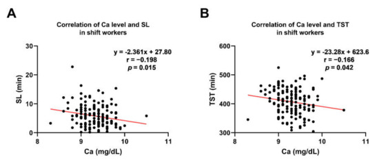 There are significant correlations between Ca levels, sleep latency, and total sleep time in shift workers. (A) Ca levels showed a negative correlation with sleep latency in the shift workers. (B) Ca levels negatively correlated with total sleep time in the shift workers. Red lines represent trend lines by linear regression. Abbreviations: SL, sleep latency; TST, total sleep time; R, Pearson’s correlation coefficient.
