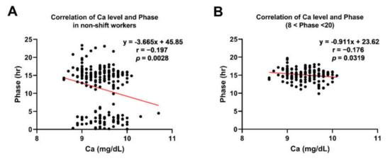 In the actigraphy-based analysis, the calcium level was negatively correlated with sleep latency and total sleep time in shift workers (Figure 5A,B; r = −0.20, p = 0.02; r = −0.17, p = 0.04, respectively). These results indicate that people with higher calcium levels tend to fall asleep easier and have shorter total sleep time. On the other hand, in non-shift workers, those significant correlations disappeared, but there was a negative correlation between calcium and phase (Figure 6A,B: r = −0.20, p = 0.0028; r = −0.18, p = 0.03). This result shows that higher calcium levels are related to earlier acrophase of activity in non-shift workers, which indicates their maximal activity present earlier during the day.