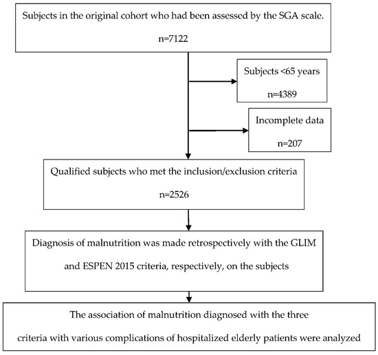 A standardized research protocol was adopted in the above-mentioned cohort study and the present study. Within 24 h of admission, patients were assessed by trained clinicians with the nutritional risk screening-2002 (NRS-2002) scale [23] and then diagnosed for malnutrition with the subjective global assessment (SGA) guideline [6,7]. Malnutrition as defined by the ESPEN 2015 guideline [8] and the GLIM framework [9] was retrospectively determined by reviewing the subjects’ data. The data collected in this study include (1) demographic parameters: gender, age, marital status, and educational level; (2) Reasons for hospitalization, medical history, weight loss, and food intake; (3) Anthropometric parameters: height, weight, mid-upper arm circumference, calf circumference, and grip strength as measured by standard methods; (4) Laboratory parameters: whole blood cell counts and blood biochemistry including albumin, total protein, pre-albumin, triglyceride, cholesterol, etc. The primary outcome of this study was the occurrence of various complications within 30 days of admission. Complications are defined as any deviation from the ideal treatment process during hospitalization such as infection, anastomotic leakage, anemia, electrolyte disorder, myocardial infarction, etc., but not including the untreated primary diseases. Infectious complications are defined as the presence of pathogens in sterile tissues that were confirmed by culture, or the presence of clinical symptoms and signs, and radiological or hematological evidence of infection. The secondary outcomes of the current study include elongation of hospital stay, being transferred to intensive care unit (ICU), days spent in ICU, total hospitalization expenses, and death during hospitalization.
