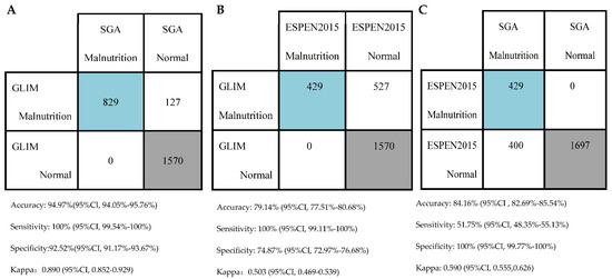 Diagnostic consistency between the criteria. (A) Consistency between GLIM and SGA. (B) Consistency between GLIM and ESPEN 2015. (C) Consistency between ESPEN 2015 and SGA. GLIM, Global Leadership Initiative on Malnutrition; SGA, subjective global assessment; ESPEN 2015, the 2015 consensus statement by the European Society for Clinical Nutrition and Metabolism.