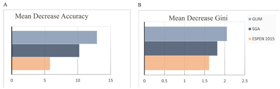 Mean decrease accuracy and mean decrease Gini coefficients of the three malnutrition diagnosis criteria predicted by the random forest algorithm. (A) Mean decrease accuracy. (B) Mean decrease Gini. GLIM, Global Leadership Initiative on Malnutrition; SGA, subjective global assessment; ESPEN 2015, the 2015 consensus statement by the European Society for Clinical Nutrition and Metabolism.