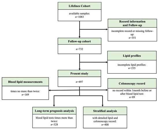 Ulcerative colitis (UC) is a subtype of inflammatory bowel disease (IBD) characterized by inflammation of the gastrointestinal tract with a relapsing-remitting pattern, and surgery and tumorigenesis are two of its most serious long-term outcomes [1]. Serious disease activity presented with increased levels of inflammatory biomarkers, and aggravated clinical manifestations were commonly attributed to the acute inflammation status. Notably, recurrent inflammatory attacks that cannot be alleviated for a long time, leading to a prolonged active disease phase, are associated with an increased risk of a poor prognosis, including abdominal surgery and tumorigenesis [2]. Dyslipidaemia is a common pathophysiological characteristic that leads to metabolic disorders, altered steroid hormone secretion, and chronic subclinical inflammation [3,4,5]. Indeed, due to alterations in the tumour cell microenvironment and systemic immune status, abnormal lipid metabolism not only affects the inflammatory condition but also affects tumour growth and invasion [3,5,6].