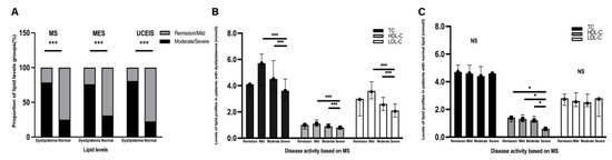 Correlation between lipid levels and disease activity. (A) The proportion of patients with dyslipidaemia and normal lipid levels is presented by bar plots and stratified according to disease activity based on MS, MES, and UCEIS. (B,C) Correlation between lipid profiles and disease activity based on MS in patients with dyslipidaemia and normal lipid levels. (B) Bar plots of levels of TC, HDL-C, and LDL-C in different groups based on disease activity in the patients with dyslipidaemia. (C) Bar graphs of the levels of TC, HDL-C, and LDL-C in different groups based on disease activity in patients with normal lipid levels. The proportion of lipid levels in patients with dyslipidaemia and normal serum lipid levels is presented by bar plots and stratified according to disease activity. The chi-square test was performed to analyse statistical significance. MS, Mayo score; MES, Mayo Endoscopic Score; UCEIS, Ulcerative Colitis Endoscopic Index of Severity; NS, no significance. Significant differences were adjusted for multiple tests by Bonferroni correction. Significant p-value < 0.05. * p < 0.05, *** p < 0.001.