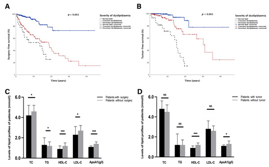 Comparison of lipid levels and lipid profiles in patients with different long-term outcomes. (A,B) Kaplan–Meier survival curve presenting the surgery-free survival (A) and tumour-free survival (B) in different groups based on the severity of dyslipidaemia. (C) Bar graphs of long-term levels of TC, TG, HDL-C, LDL-C, and ApoA1 between patients who were surgery-free and those who underwent surgery. (D) Bar graphs of long-term levels of TC, TG, HDL-C, LDL-C, and ApoA1 between tumour-free and tumour-bearing patients. NS, no significance. Significant p-value < 0.05. * p < 0.05, *** p < 0.001. Surgery-free survival was defined as the period from diagnosis to UC-related surgery. Tumour-free survival was defined as the period from diagnosis to tumorigenesis. Transient dyslipidaemia was defined as occurrence of dyslipidaemia not more than twice during the whole following period. Persistent dyslipidaemia was defined as times of dyslipidaemia occurring not less than three times during the whole following period.