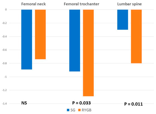 The clinical relevance of the mean decrease in BMD is that 2 years after surgery, up to 2.1% of patients showed t-score values in the range of osteoporosis and up to 5.7% in the range of osteopenia, without significant differences between the surgical procedures. However, the mean BMD reduction was significantly higher among patients undergoing a RYGB at the lumbar spine and the femoral trochanter, without differences at the femoral neck. This is probably a consequence of a higher increase in PTH values in the group of patients with RYGB.