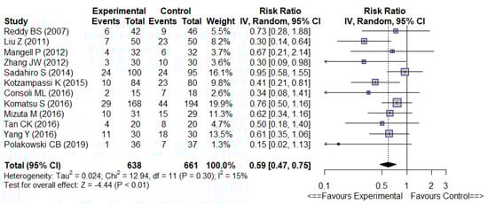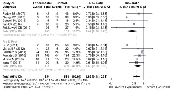 There was no significant difference between the groups whether the RCTs were conducted in Asia or in the West for overall infectious complications (RR 0.62 [0.46–0.83], I2 = 31% versus RR 0.47 [0.30–0.75], I2 = 0%, respectively) (Figure S9).