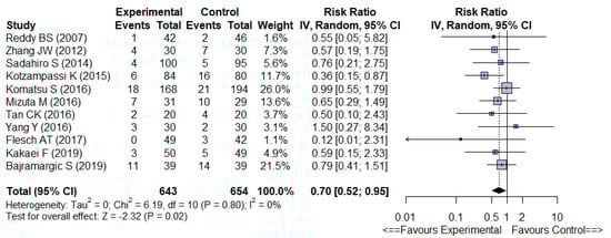 The meta-analysis (Figure 2) showed overall significantly fewer infectious complications (12 trials, RR 0.59 [0.47–0.75], p < 0.01) with low heterogeneity (I2 = 15%) and significantly fewer SSI (11 trials, RR 0.70 [0.52–0.95], p = 0.02) with no heterogeneity (I2 = 0%), in the probiotic or synbiotic group (Figure 3).