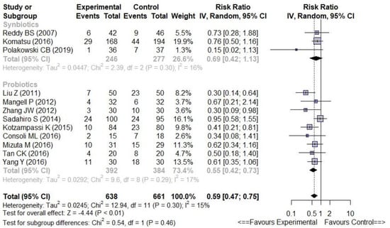 Since the main outcome (overall infectious complications) was considered in this subgroup analysis, only three trials (reporting this outcome) were included. There were fewer overall infectious complications (9 trials, RR 0.55 [0.42–0.73], I2 = 17%) (Figure 4) and fewer SSIs (8 trials, RR 0.63 [0.44–0.91], I2 = 0%) in the Prob subgroup (Figure S5) compared with controls. By contrast, there were no significant differences between the Synb subgroup and controls for overall infectious complications and SSIs (3 trials, RR 0.69 [0.42–1.13], I2 = 16% and RR 0.87 [0.47–1.60], I2 = 2%, respectively) (Figure 4 and Figure S5). Nevertheless, the comparison between the respective effects of probiotics and synbiotics showed no significant difference (p = 0.46, Figure 4).