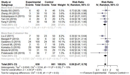 There were no significant differences for overall infectious complications whether multistrain formulations (more than 2 strains) or non-multistrain ones were used (5 trials RR 0.52 [0.37–0.74], I2 = 0% and 7 trials RR 0.61 [0.43–0.87], I2 = 37%, respectively) (Figure 5).