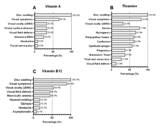 Numbers refer to the percentage of patients with each reported clinical symptom and sign associated with deficiencies in (A) vitamin A (12 cases), (B) thiamine (40 cases), and (C) vitamin B12 (11 cases). If a particular symptom or sign was not reported, then we assumed it was not present. Wernicke’s triad is defined as ophthalmoplegia, altered mental status (confusion) and ataxia.