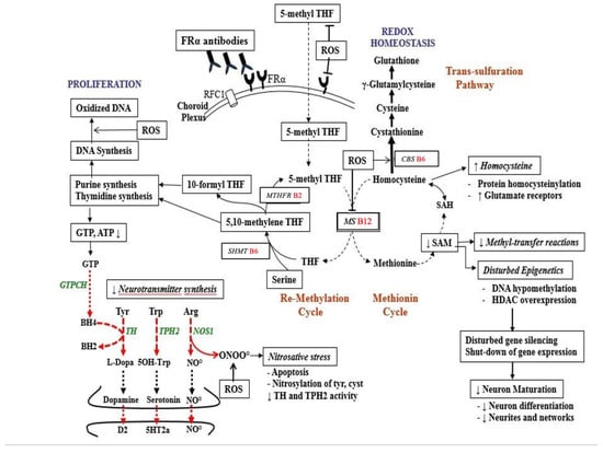 Elevated concentrations of reactive oxygen species (ROS) predispose to increased catabolism of plasma MTHF pool, and down regulate both intracellular folate uptake and trans-cellular folate transport mechanisms by ROS mediated chemical reactions affecting the functional integrity of the FRα and RFC1 proteins [31]. In addition, ROS interferes at different levels, resulting in dysfunction of various enzymes serving intermediary folate metabolism (methionine synthase), the enzyme neuronal tryptophan hydroxylase, and leading to oxidation of DNA [61,62,63,64,65].