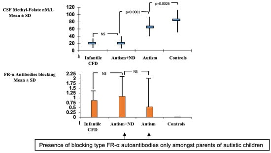 A group of children with infantile autism, who had no neurological deficits, have been studied subsequently and revealed CSF MTHF levels which were not as low as compared to infantile CFD or low-IQ autism with neurological deficits, but were still low or within the low normal reference range with a statistical difference compared to the normal CSF folate reference range among healthy controls (Figure 3). Their FRα autoantibody titers are in the same range as those for children with infantile CFD or low-IQ autism with neurologic abnormalities. Compared to the almost complete absence of FRα autoimmunity in age-matched healthy control children and their parents, the parents of children with infantile autism had FRα autoimmunity in a significant proportion of the families [2,43]. Thus, in children with infantile autism, FRα autoimmunity can be acquired after birth by the child and can be absent or present in either one or both parents. For each family, eight different scenarios for the presence or absence of FRα autoimmunity for each trio (child, father, mother) can occur [43].