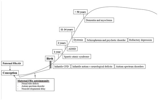 In summary, the occurrence of a specific neurologic or psychiatric condition associated with CFD due to FRα autoimmunity depends on the age of onset when these FRα autoantibodies develop and on the presence or absence of parental FRα autoimmunity, particularly among families with children suffering from autism spectrum disorder (Figure 4).