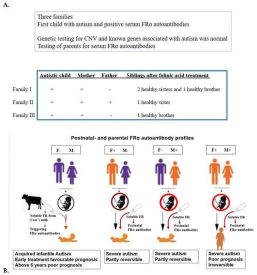 Likewise, children with infantile-onset autism associated with FRα autoimmunity should also be identified early to start folinic acid therapy and a diet as early as possible, to improve final prognosis. However, the simultaneous presence of FRα antibodies in the autistic child and either one parent impedes neurologic recovery and the resolution of core autistic signs and symptoms, following folinic acid therapy. Finally, the presence of FRα antibodies in both parents has a negative impact with poor outcome and prognosis despite folinic acid and dietary treatment [43]. Thus, if folinic acid therapy is not followed by the significant recovery of the child after four months, serum testing of FRα antibodies in both parents should be considered to elucidate the poor effect of treatment [43]. If treatment does not lead to any improvement, further metabolic and genetic testing should be considered as more than 1000 different genetic causes have been identified in autism spectrum disorders [72] (see also SFARI gene database). Additional testing for inborn errors of metabolism and genetic causes of autism spectrum disorder should be considered early in the initial diagnostic process if dysmorphic features are found in the presence of organ malformations, parental consanguinity, or other affected first-degree family members. The use of new genetic techniques (array CGH and WES analysis) can be helpful to reach a diagnosis for this group of genetically determined disorders [72].