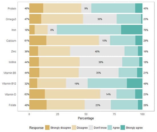 Agreement on the risk of folate deficiency in a vegan diet may therefore be interpreted as a marker of limited knowledge in these diets, and such physicians might be more likely to discourage patients from switching to a vegetarian diet. These initial results suggest a lack of awareness and some apprehension of GPs and pediatricians regarding the care of vegetarian patients. Pediatric academic societies have taken different positions worldwide. In France, the Pediatric Hepatology, Gastroenterology and Nutrition Group, advises against a vegan diet in children []. Regular dietary monitoring is essential in vegan children, where vitamin D (also noted for other diets) and vitamin B12 supplementation is necessary. Iron, calcium, docosahexaenoic acid, iodine, and zinc can be supplemented on a case-by-case basis.