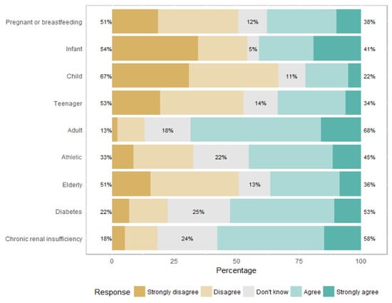 The OLV diet was considered unsuitable for children under six months by 94 physicians (54%), for children over six months by 116 physicians (67%), for teenagers by 93 physicians (53%), for pregnant and breastfeeding women by 87 physicians (51%), and for elderly persons by 88 physicians (51%) (Figure 3). The vegan diet was deemed unsuitable by most of the physicians for all specific subgroups: children under six months (n = 148, 87%), children over six months (n = 161, 95%), teenagers (n = 143, 83%), pregnant and breastfeeding women (n = 155, 91%), and elderly persons (n = 137, 81%) (Figure 4).