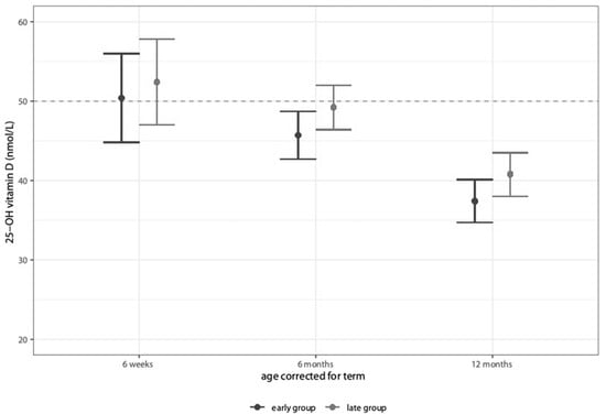 At 6 weeks corrected age, 46% of the early and 51% of the late group (p = 0.9); at 6 months corrected age, 53% and 40% (p = 0.03); and at 12 months corrected age, 65% and 57% (p = 0.16) showed deficient Vitamin D values < 50 nmol/L, respectively. After correction for multiple testing, differences were statistically not significant.