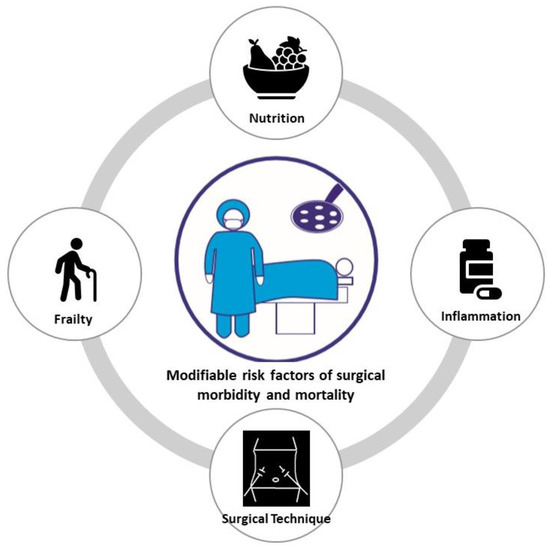 The identification of risk factors provides an opportunity to optimize perioperative care through improved patient management and a diminished risk of postoperative complications and associated mortality. Various clinical factors are known to influence postoperative morbidity and mortality: (i) Patient characteristics: age, frailty, male sex, and the American Society of Anesthesiologist (ASA) score; (ii) preoperative inflammatory biomarkers, (iii) comorbidities; (iv) intoxication: smoking and alcohol consumption; (v) nutritional-related risk factors: malnutrition/preoperative weight loss and sarcopenia; (vi) disease-related risk factors: preoperative tumor complications and advanced tumor stage; and (vii) intraoperative techniques and care. Among these clinical factors, tumor status, surgery difficulty, and comorbidities are intrinsic to a patient and cannot be directly addressed. Therefore, to improve the patient’s postoperative prognosis, it is necessary to focus on modifiable risk factors, which can be partially or fully treated. Recently, it has been reported that the nutritional status, inflammation, frailty and surgical approach are related to postoperative morbidity and mortality (Figure 1). Therefore, in this review article, we summarize the current evidence regarding these modifiable risk factors influencing surgical morbidity and mortality in cancer patients.