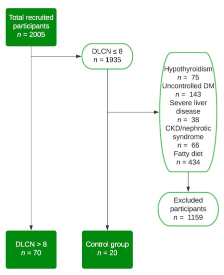 Between 1 December 2020 and 31 March 2022, we identified, from 2005 patients that were admitted to our clinic, 70 patients with FH that satisfied the inclusion criteria in order to take part in our study. All our patients were older than 18 years old, signed the informed consent, and had more than 8 points in the DLCN score. In addition, we included 20 patients in the control group that had a DLCN score ≤ 8 points with a normal lipid profile. Patients who did not fulfill these criteria were not taken into consideration in the research. In order to rule out the possibility of secondary hypercholesterolemia, patients who presented at least one of the following conditions were excluded from the study: diabetes mellitus with uncontrolled glycemic values, hypothyroidism, nephrotic syndrome, severe chronic kidney disease, severe liver disease, and meals with higher saturated and trans-unsaturated fatty acids (Figure 1).
