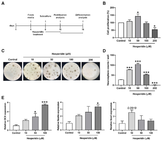 The effects of hesperidin on cell proliferation in neural stem cells isolated from mouse embryonic brain. (A) In vitro neurosphere culture and experiment scheme. Cells were pretreated with 10, 50, 100, and 200 µM hesperidin for 4 days. (B) Cell proliferation (%) was measured using a WST-1 assay. (C,D) Representative images showing proliferation and the number of neurospheres of at least 100 µm in the graph. (E) Neural stem cell-specific proliferation was confirmed by measuring the mRNA levels of DCX, nestin, and Sox2 by qRT-PCR. Statistical analysis included one-way analysis of variance and Tukey’s post hoc test. * p < 0.05 and *** p < 0.001 compared with the vehicle-treated control group. Data are shown as mean ± SEM (n = 3 per group).