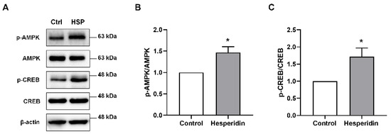 The effects of hesperidin on AMPK/CREB signaling in neurospheres. To prove the neurogenic effects of HSP, we measured AMPK and CREB protein levels in vitro. Phosphorylated/total AMPK and CREB were analyzed by western blot. (A) Representative images of AMPK and CREB in neurosphere lysates. (B,C) Quantification of AMPK (B) and CREB (C) expression. Statistical analysis included Student’s t test. * p < 0.05 compared with the vehicle-treated control group. Data are shown as mean ± SEM (n = 3 per group).
