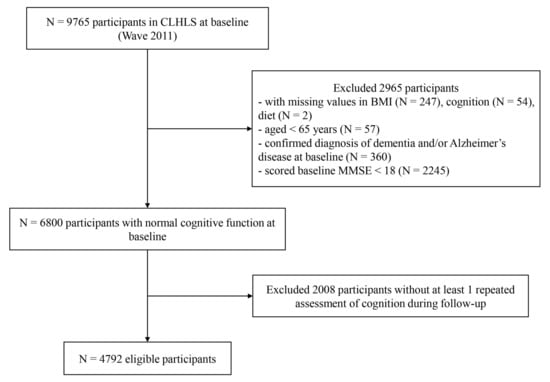 Since the height and weight information were first objectively measured in the sixth wave (2011), our research considered the sixth wave (2011) as the baseline. The seventh wave (2014) and the eighth wave (2018) were considered as the follow-up. Figure 1 shows the detailed flowchart of participant selection for the current study. A total of 9765 participants attended the 2011 cycle survey of the CLHLS. Of these, 360 were excluded for the following reasons: they had missing height or weight measurements (n = 247), they did not complete the cognitive measurements (n = 54), they did not complete the dietary assessments (n = 2), or they were younger than age 65 at baseline (n = 57). An additional 2245 participants were excluded due to cognitive impairment at baseline, and an additional 360 participants had a confirmed diagnosis of dementia and/or Alzheimer’s disease at baseline. In addition, 2008 participants without at least one follow-up assessment of cognition were excluded. The remaining 4792 individuals were included in the analyses.