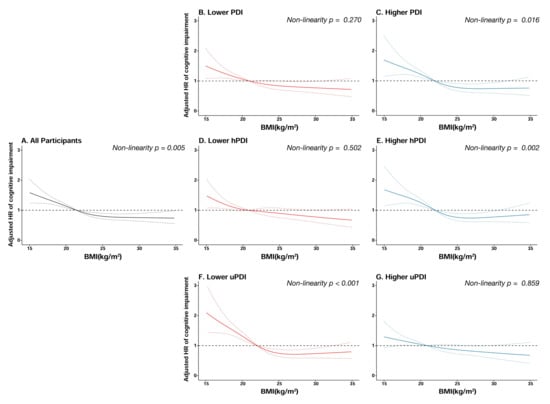 Cubic splines for the associations of baseline BMI with cognitive impairment, stratified by plant-based diet indices. (A): all participants; (B): lower plant-based diet index (PDI); (C): higher plant-based diet index (PDI); (D): lower healthful plant-based diet index (hPDI); (E): higher healthful plant-based diet index (hPDI); (F): lower unhealthful plant-based diet index (uPDI); (G): higher unhealthful plant-based diet index (uPDI).