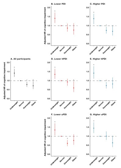 Hazard ratios and 95% CIs for developing cognitive impairment by baseline body-mass-index groups, stratified by plant-based diet indices. *: p < 0.05. (A): all participants; (B): lower plant-based diet index (PDI); (C): higher plant-based diet index (PDI); (D): lower healthful plant-based diet index (hPDI); (E): higher healthful plant-based diet index (hPDI); (F): lower unhealthful plant-based diet index (uPDI); (G): higher unhealthful plant-based diet index (uPDI).