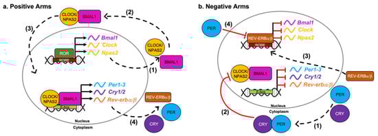 The Circadian Transcription–Translation Feedback Loop (TTFL). (a) Positive arms of the TTFL (1) ROR binding to the RORE initiates transcription of Bmal1, Clock and Npas2, which are shuttled to the cytoplasm for translation. (2) BMAL1 and CLOCK/NPAS2 form a complex in the cytoplasm. (3) The BMAL1:CLOCK/NPAS2 complex translocates to the nucleus where it binds to E-box elements to (4) upregulate transcription of Per, Cry and Rev-erbα/β and other core clock genes; (b) Negative arms of the TTFL (1) PER and CRY form a complex that (2) translocates to the nucleus and inhibits the transcriptional activity of BMAL1::CLOCK/NPAS2. REV-ERBα/β translocates to the nucleus and represses the transcription of Bmal1, Clock and Npas2. (4) PER monomers inhibit REV-ERBα/β.