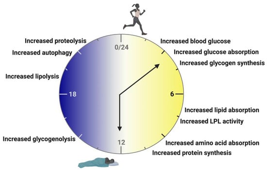 The rhythms of carbohydrate, lipid, and protein metabolism have been detailed in previous publications in both human and rodent populations [,,,,,,,,]. During the active phase (light cycle for humans (Figure 2); dark cycle for rodents), food consumption results in an increase in blood glucose that elicits increased glucose absorption and glycogen synthesis in the skeletal muscle and liver [,,,] (Figure 2). Lipids are also absorbed more readily, and lipoprotein lipase activity increases [,,,] (Figure 2). Amino acid absorption and protein synthesis in the skeletal muscle and liver have also been found to increase during active-phase food consumption [,,] (Figure 2).