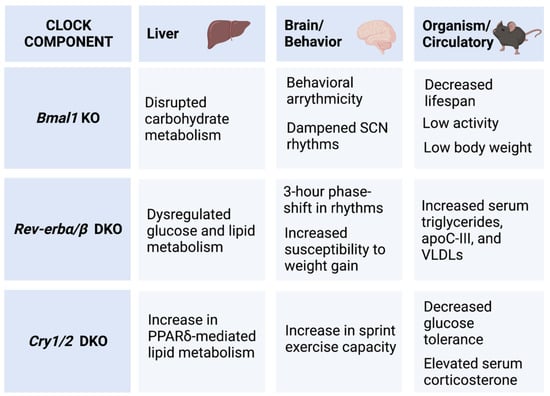 Select Effects of Molecular Clock Knockouts. Examples of select metabolic effects arising from molecular clock knockouts. Created with BioRender.com (accessed on 28 June 2022).