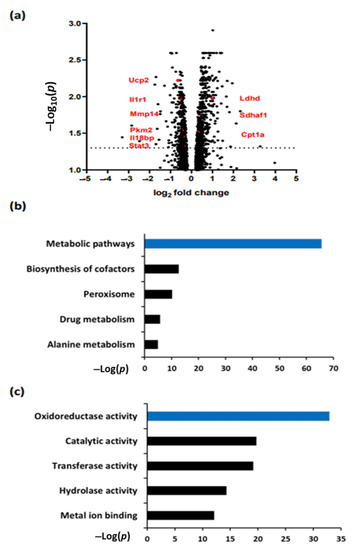 aPC regulates metabolic pathways and oxidoreductase activity in DKD. (a) Volcano plot showing differentially expressed genes (DEGs) in APChigh-DM mice compared with WT-DM mice. Example genes related to metabolism and inflammatory pathways are shown in red (bold). (b) KEGG pathway analysis of renal (induced) DEGs enriched by DAVID in APChigh-DM mice compared to WT-DM mice. The bar plot shows the enrichment scores (-log [p value]) of the significantly enriched KEGG pathways. (c) KEGG pathway analysis of metabolism-related DEGs enriched by DAVID in APChigh-DM mice compared to WT-DM mice. The bar plot shows the enrichment scores (−log [p value]) of the significantly enriched KEGG pathways.
