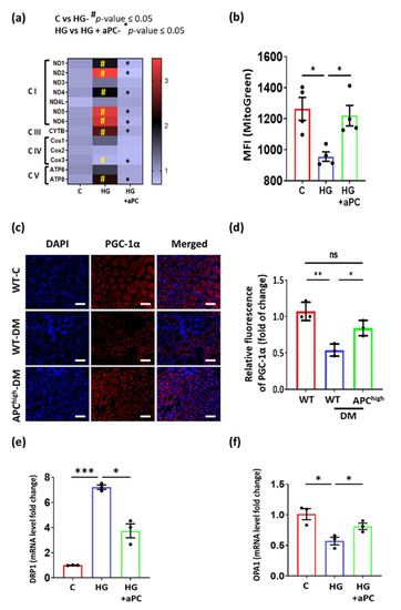 As we conducted bulk sequencing, changes in gene regulation likely reflect changes in tubular cells, which constitute approximately 80% of renal cells. Accordingly, to determine the effect of aPC on mitochondria, we used tubular cells for in vitro experiments. Exposing murine tubular cells to high glucose (25 mM, 24 h) induced the expression of various genes involved in the electron-transport chain (ETC), implying mitochondrial dysfunction. Pretreatment of murine tubular cells with aPC (20 nM, 1 h) prevented the high glucose-induced induction of genes related to the ETC (Figure 2a). To analyse mitochondrial biomass, we performed FACS using MitoTracker Green, which accumulates in mitochondrial lipid membranes. Exposing murine tubular cells (BUMPT) to high glucose (25 mM, 24 h) reduced the accumulation of MitoTracker Green, suggesting a loss of mitochondrial biomass. This glucose-induced effect was prevented by pretreatment with aPC (20 nM, 1 h, Figure 2b), corroborating the protective effect of aPC on mitochondria. We next studied the effect of aPC on PGC-1α, a master regulator of mitochondrial biosynthesis, which is abundantly expressed in renal tubular epithelial cells [26]. Tubular PGC-1α expression, as determined by immunohistochemistry, was reduced in 24-week-old diabetic mice compared to nondiabetic control mice. In diabetic APChigh mice, PGC-1α expression was partially maintained compared to nondiabetic WT mice (Figure 2c,d). To further analyse mitochondrial dynamics, we analyzed mRNA expression of DRP1 and OPA1 in control, high glucose, and high glucose with aPC exposed cells. DRP1, as a marker of mitochondrial fission, and OPA1, as a marker of mitochondrial fusion, convey important functions in mitochondrial biogenesis. The high-glucose induced changes were reversed upon exposure of cells to aPC (Figure 2e,f). The protection of mitochondrial biomass and PGC-1α by aPC in DKD suggests that aPC maintains mitochondrial function in tubular cells despite persistently elevated glucose levels.