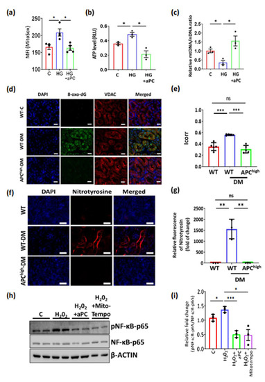 Given the above results showing the regulation of pathways related to oxidoreductase activity and the protection of mitochondrial markers by aPC despite high glucose, we next investigated the effect of aPC on high glucose-induced ROS production in tubular cells. First, the exposure of mouse tubular cells (BUMPT) to a high glucose concentration (25 mM, 24 h) induced ROS formation, as reflected by increased MitoSox staining. Pretreatment with aPC (20 nM, 1 h) before exposing cells to high glucose prevented increased ROS formation (Figure 3a), indicating that aPC reduces high glucose-induced ROS production in tubular cells. In addition, aPC prevented high glucose-induced ATP levels and restored mitochondrial DNA content in tubular cells (Figure 3b,c). To determine whether aPC has an effect on tubular ROS production in vivo, we studied reactive metabolites generated upon increased ROS generation. First, we stained renal sections for 8-oxo-dG, a marker for ROS-induced DNA damage, together with the mitochondrial marker VDAC. While in nondiabetic control mice, 8-oxo-dG staining was low and in particular did not colocalize with the mitochondrial marker VDAC, staining for 8-oxo-dG was induced and prominently colocalized with VDAC in tubular cells of diabetic mice (Figure 3d,e). In contrast, in diabetic APChigh mice, both the staining intensity for 8-oxo-dG and colocalization with VDAC were markedly reduced. These results indicate that ROS induce DNA damage in tubular cells of diabetic mice, particularly in mitochondria, which, however, can be prevented by aPC. Next, we determined the reactive metabolite peroxynitrite (ONOO-). Compared to nondiabetic wild-type control mice, staining for nitrotyrosine was markedly enhanced in the tubular compartment of diabetic wild-type mice. Increased nitrotyrosine staining was not apparent in diabetic APChigh mice (Figure 3f,g). Increased ROS generation drives NF-ĸB signalling, which is closely linked to diabetic complications, including DKD [27,28,29]. To determine whether aPC dampens ROS-induced NF-ĸB activation, we stimulated mouse tubular cells (BUMPT) with H2O2 (100 µM, 24 h), which induced phosphorylation of the p65 NF-ĸB subunit, reflecting NF-ĸB activation (Figure 3h,i). Pretreatment of BUMPT cells with the mitochondrial ROS scavenger MitoTempo (10 µM, 1 h) or with aPC (20 nM, 1 h) prevented ROS-induced p65 NF-ĸB phosphorylation (Figure 3h,i). Taken together, these results demonstrate that aPC reduces high glucose-induced tubular ROS generation.
