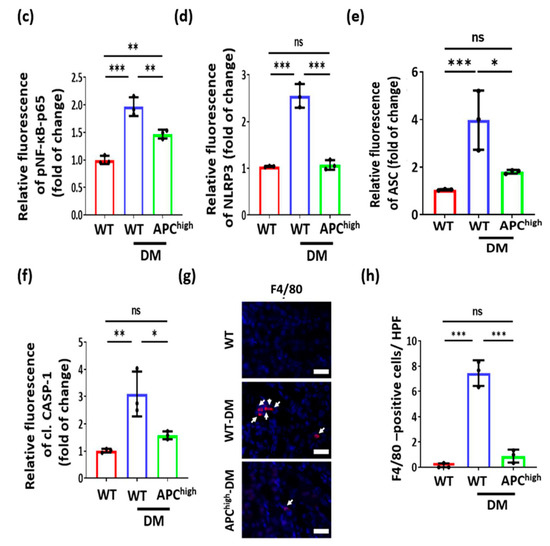 aPC reduces inflammasome activation in hyperglycaemia. (a) Bar graph with dot plot summarizing mRNA levels of p65 NF-ĸB, Nlrp3, Asc, and Casp1 (q-RT–PCR) in control (normal glucose, 5 mM) and high glucose (25 mM)-treated BUMPT cells without (HG) or with aPC pretreatment (20 nM, 1 h, HG + aPC). (b–f) Representative immunofluorescence images (b) and bar graphs with dots summarizing the results (c–f) of kidney sections stained for pNf-ĸb-p65, Nlrp3, cleaved caspase-1 or Asc (all red, DAPI nuclear counterstain, blue; groups as described in a. (g,h) Representative immunofluorescence images (g) and bar graphs summarizing the results (h) of kidney sections stained for macrophages (F4/80, red; DAPI nuclear counterstain, blue); arrow indicates positive staining. * p < 0.05; ** p < 0.01; *** p < 0. 001 (a,c–f,h). Statistical analyses were performed using one-way ANOVA with Sidak’s multiple comparison test. aPC = activated protein; ASC = adaptor molecule apoptosis-associated speck-like protein containing a CARD; C = control; Casp1 = Caspase- 1; DAPI = 4′,6-diamidino-2-phenylindole; DM = diabetes mellitus; HG = high glucose; MFI= mean fluorescent intensity; NF-κB = Nuclear factor kappa-light-chain-enhancer of activated B cells; NLRP3 = NLR family pyrin domain containing 3; VDAC = voltage-dependent anion channel; WT = wild-type.